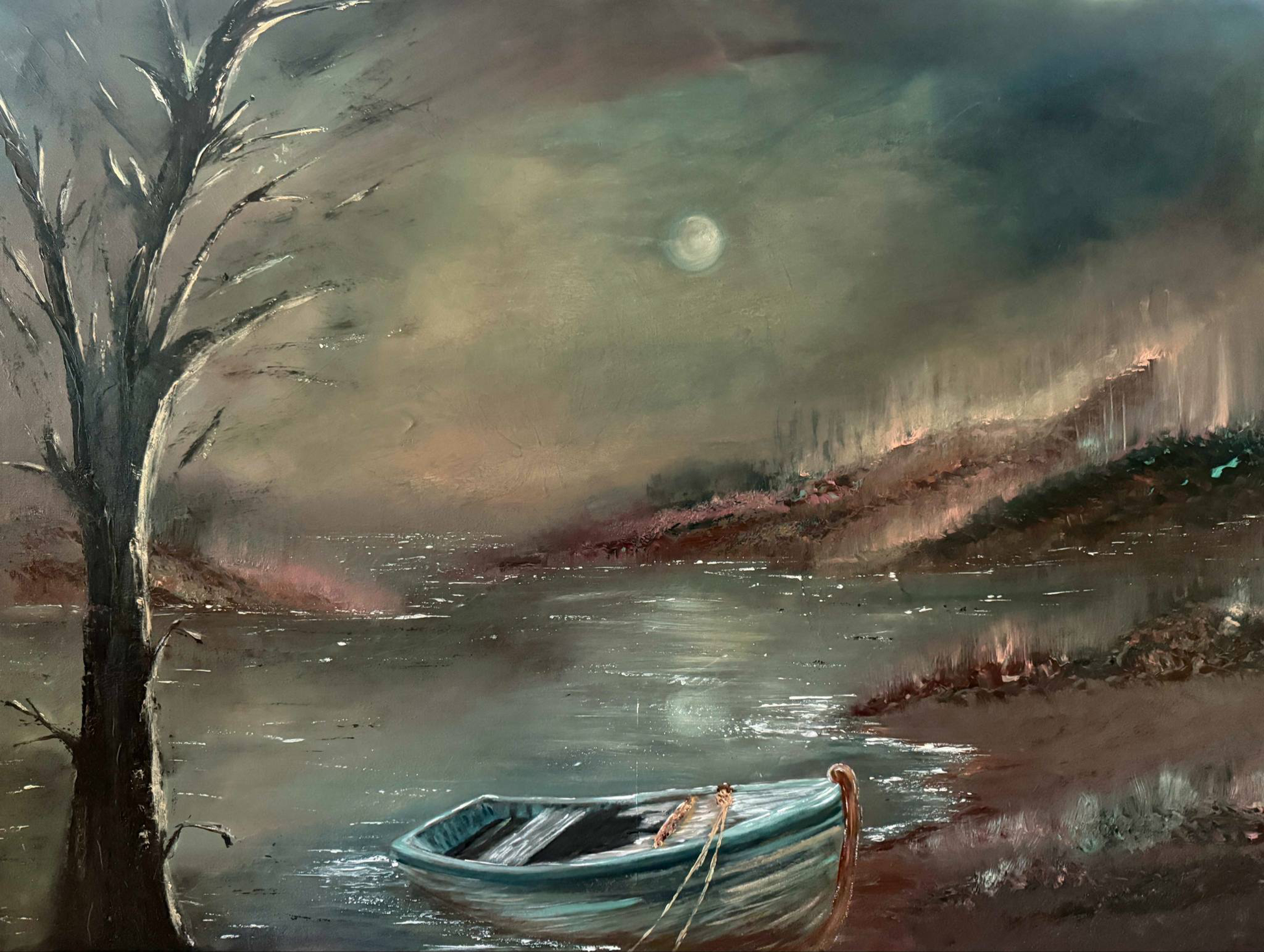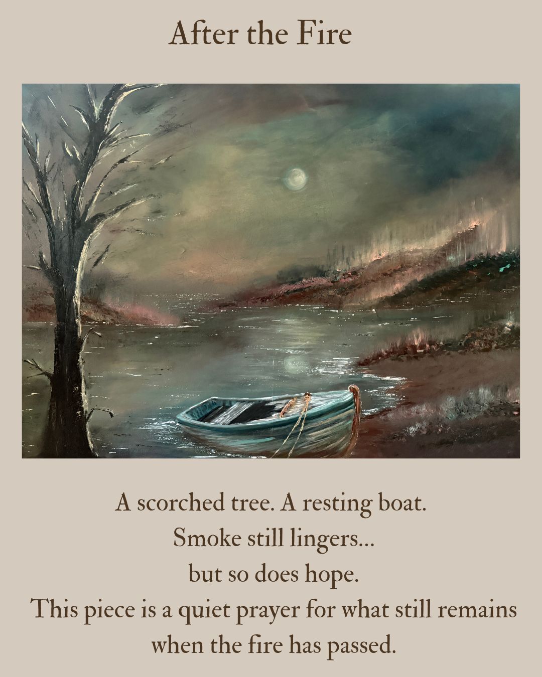 A lone rowboat rests along a smoky shore. The sky glows faintly in the distance, like embers fading but not forgotten. A scorched tree stands guard—silent, but still standing. Somehow, what started as an abstract became a prayer—for restoration, for resilience, for what still remains when the fire is gone.