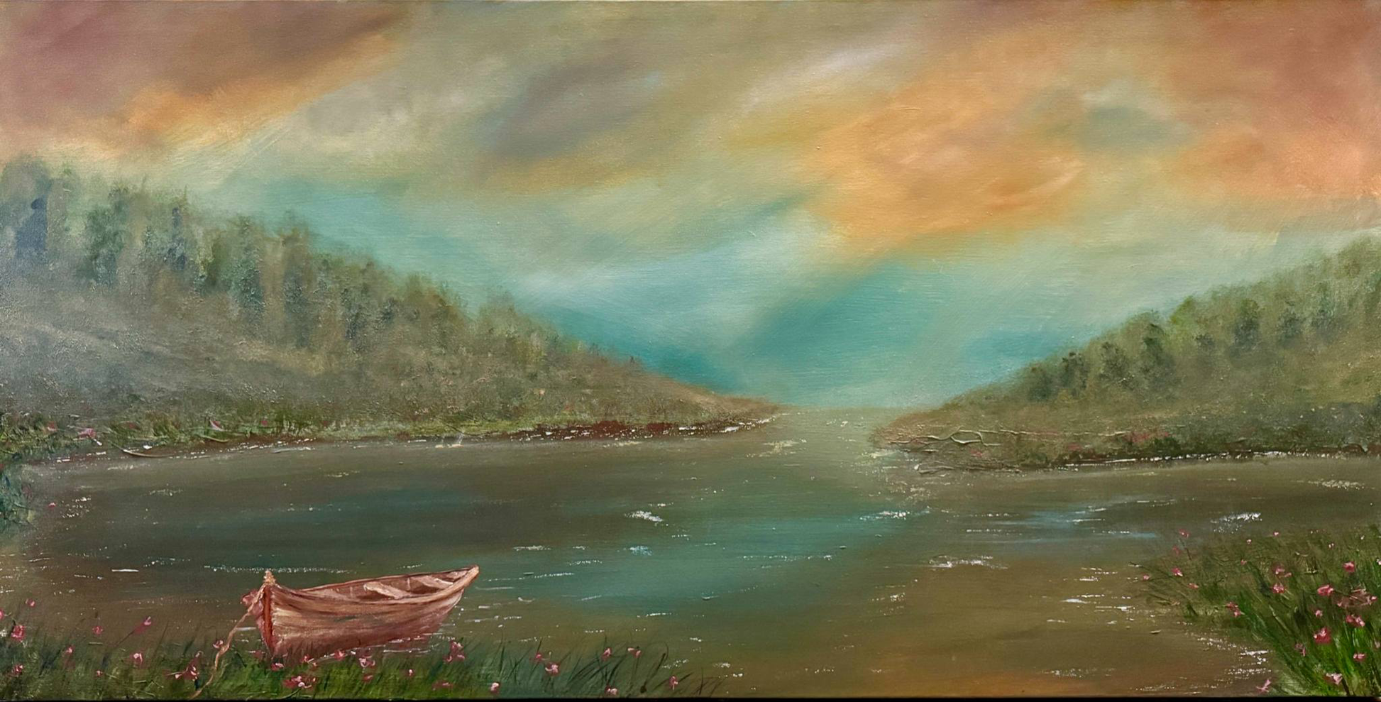 This original 24x48 canvas invites you into a soft, dreamlike landscape. Misty trees rise gently along the shoreline, framing a glowing sky in hues of golden apricot, teal, and clouded rose. The water is calm, reflecting just enough light to guide you forward—but not so much that it rushes you. And anchored quietly in the foreground? A small, worn boat… resting in the wildflowers, as if it finally made it back.