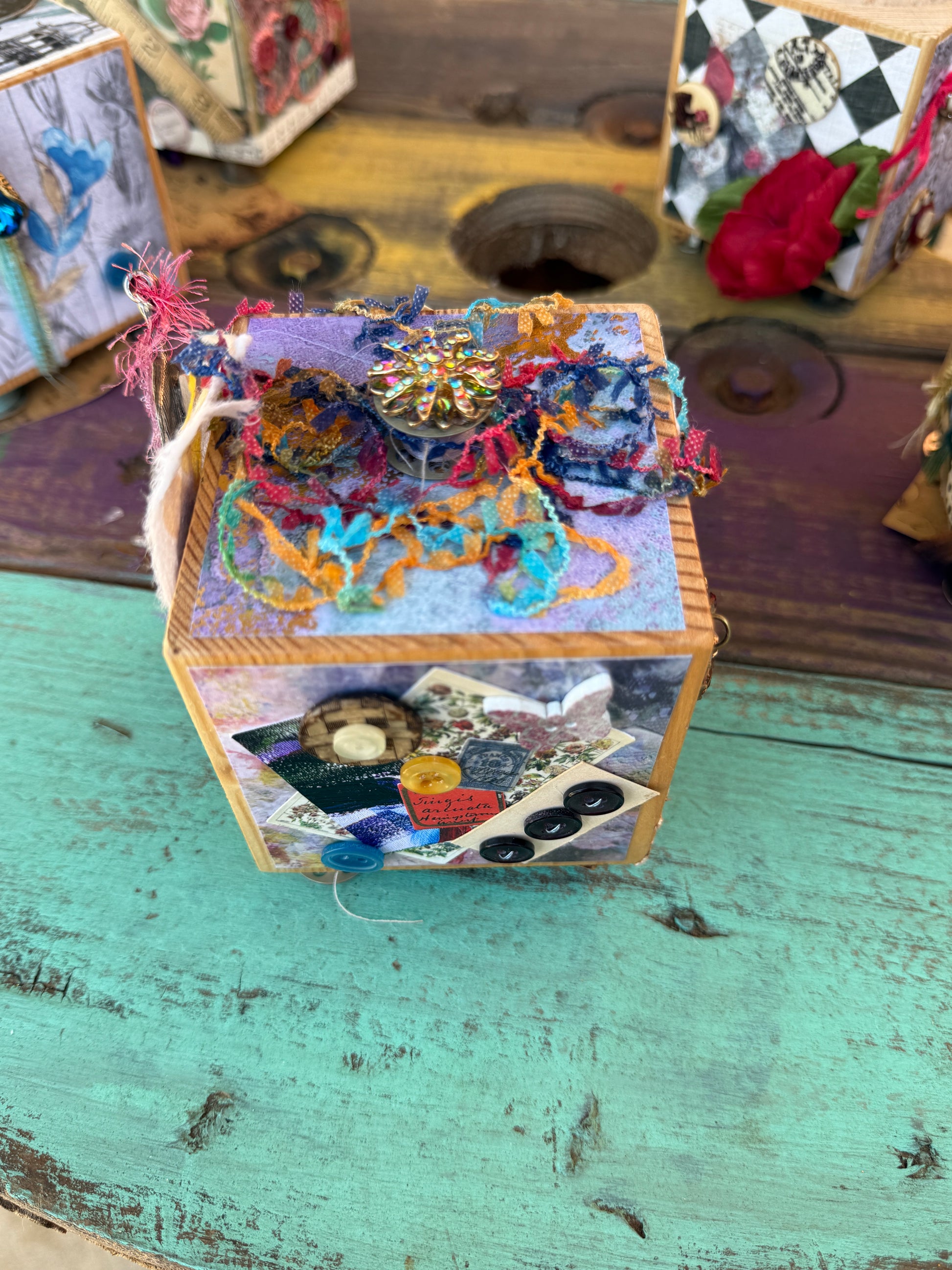 Each side is adorned with bits of ribbon, buttons, paper scraps, thread, and tiny details that tell a story of joy reclaimed from the in-between places. Every cube includes a small piece of original art and vintage-style embellishments ... no two are ever alike.