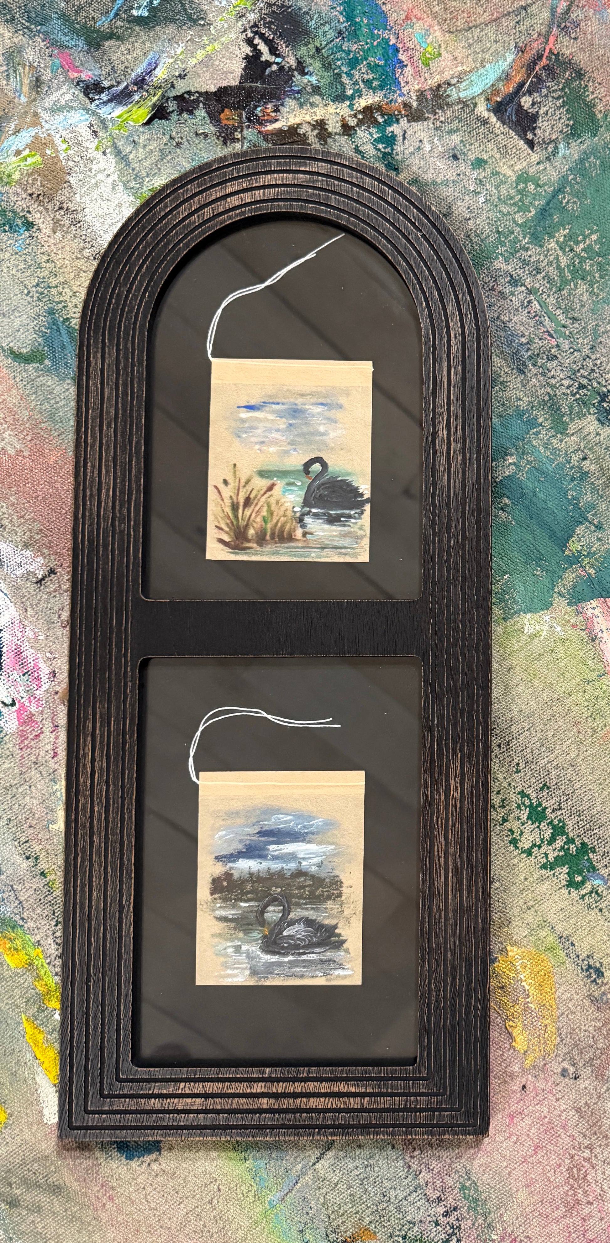 In the Quiet features two hand-painted tea bags set inside a tall arched black wood frame. Each depicts a black swan—calm, poised, and anchored in reflection. The skies above them shift in mood and light, hinting at storms weathered and grace found in the stillness after.
