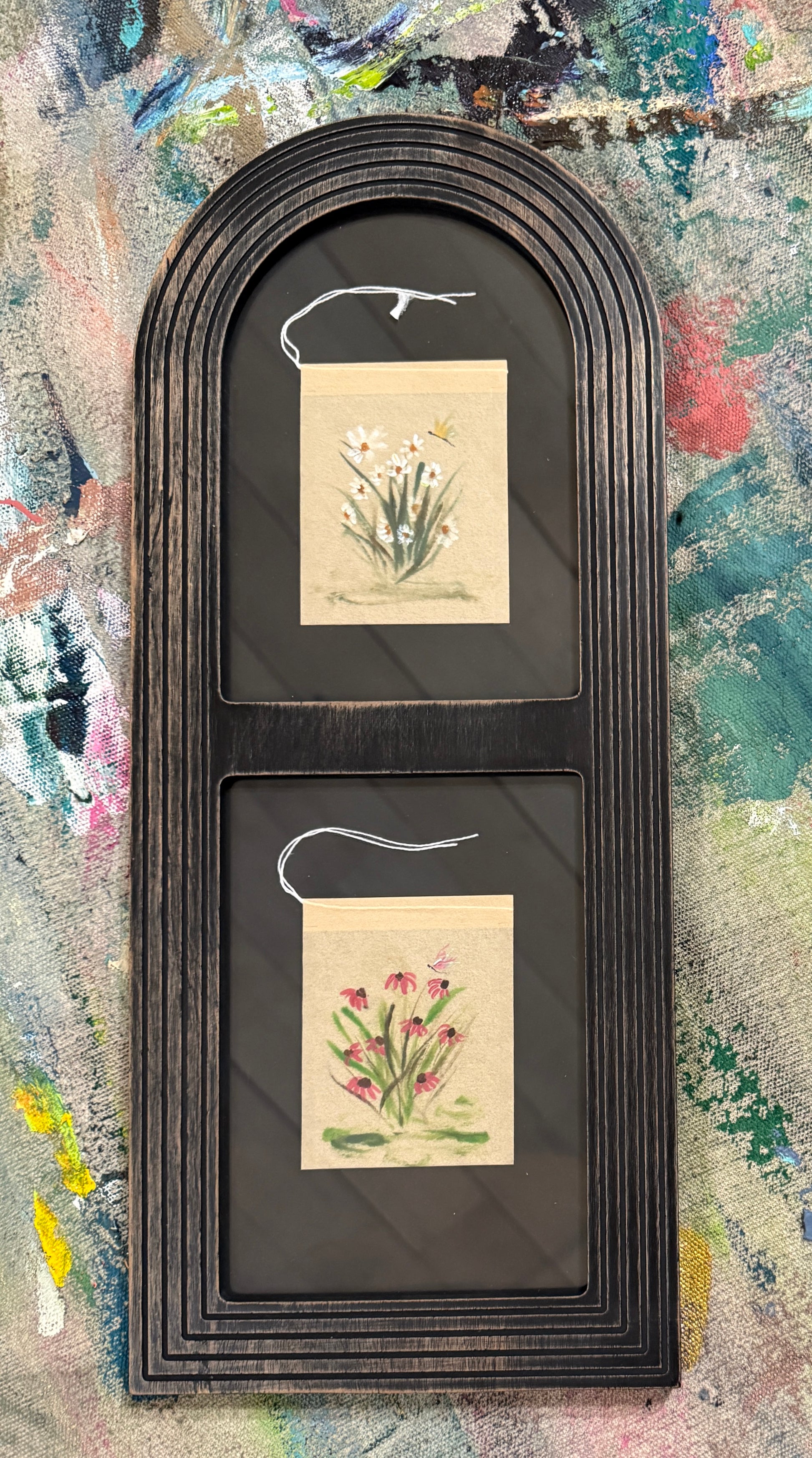 Rooted in Bloom features two hand-painted tea bags displayed in an arched black wood frame, each capturing the gentle strength of flowers that know how to rise. One features a spray of delicate daisies; the other, a field of coneflowers reaching toward the light. Together, they speak of growth, grace, and joy in the ordinary.