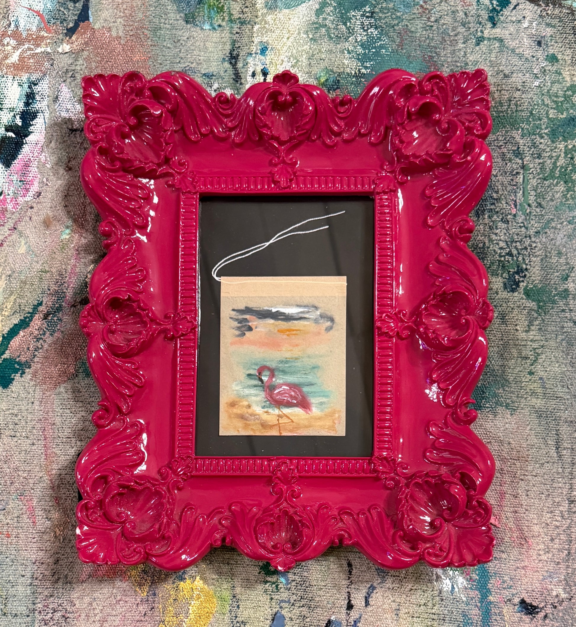 There’s something sacred about the small things—like the way this flamingo stands still, watching, waiting, beautifully unbothered. Painted on an upcycled tea bag, this one-of-a-kind miniature artwork captures the charm of coastal stillness and quiet strength, right in the palm of your hand (or perched in a bright pink frame if we’re being honest).