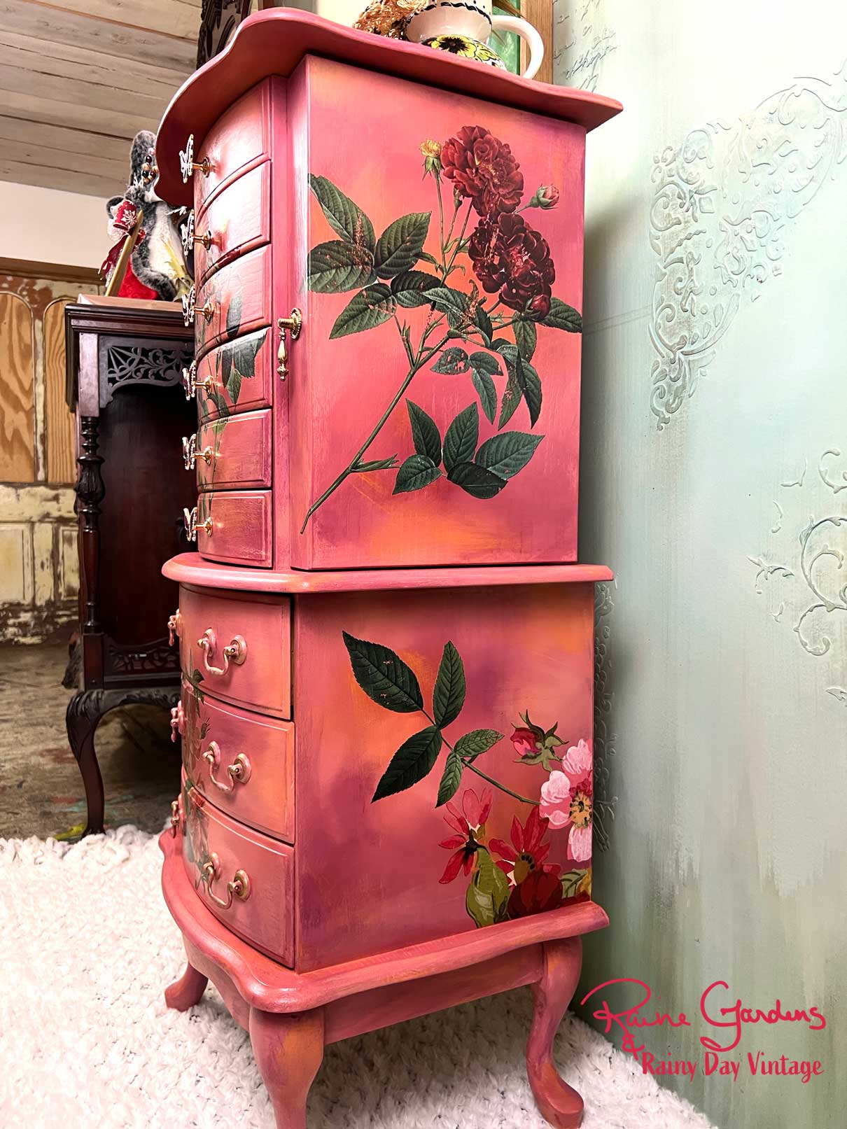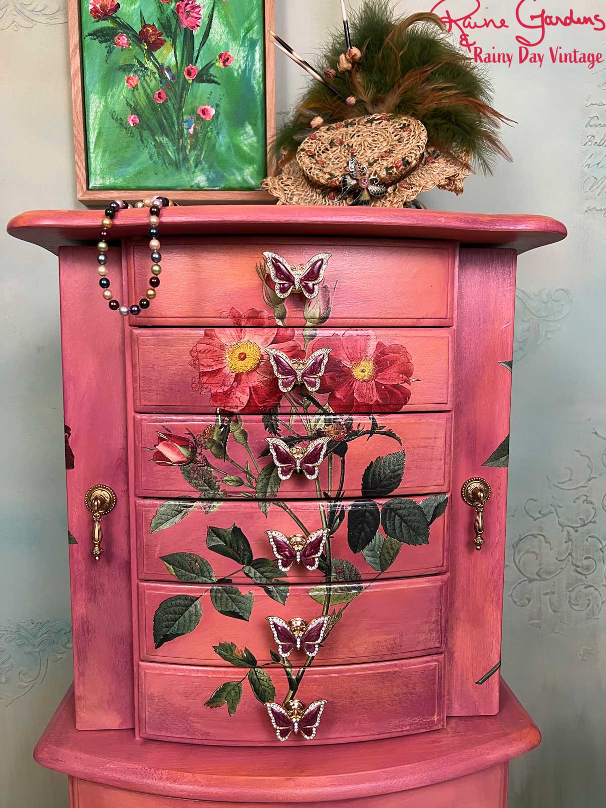 Floor model jewelry armoire in deep, rich pink tones! Embellished with Roses and Butterfly Pulls!