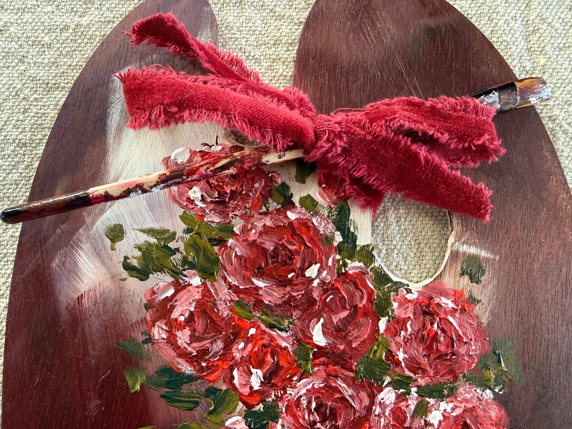 This is an original, one-of-a-kind floral study painted on a wooden artist palette.