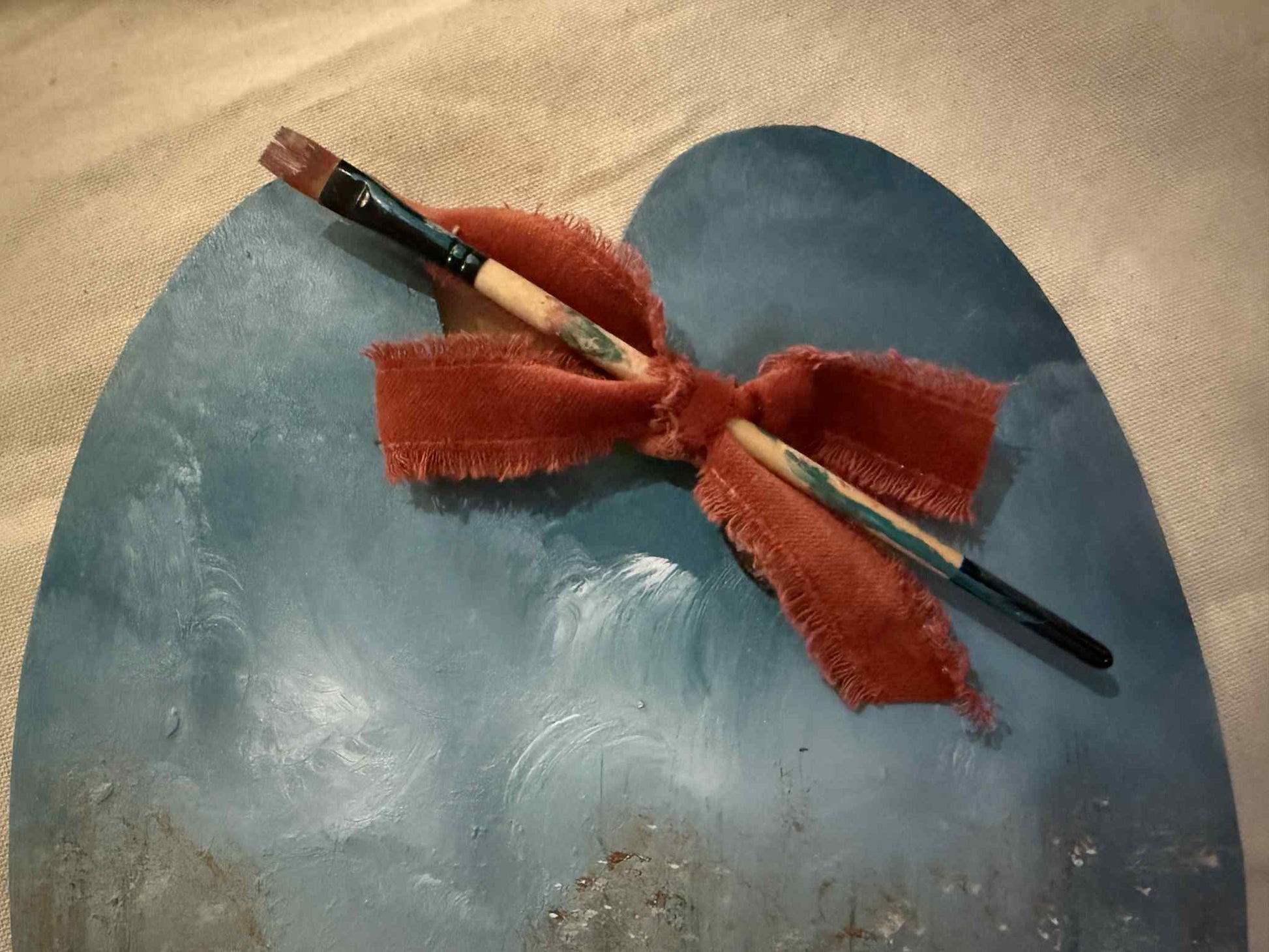 Every palette keepsake begins in the mess of my studio... layers of paint, fingerprints, and real moments of the In-Between. Once the artwork is complete, I finish each piece with a hand-tied velvet ribbon and paint touched brush. It’s a tiny piece of my creative walk, sealed into a keepsake you can hold onto or gift to someone who needs a reminder of hope.