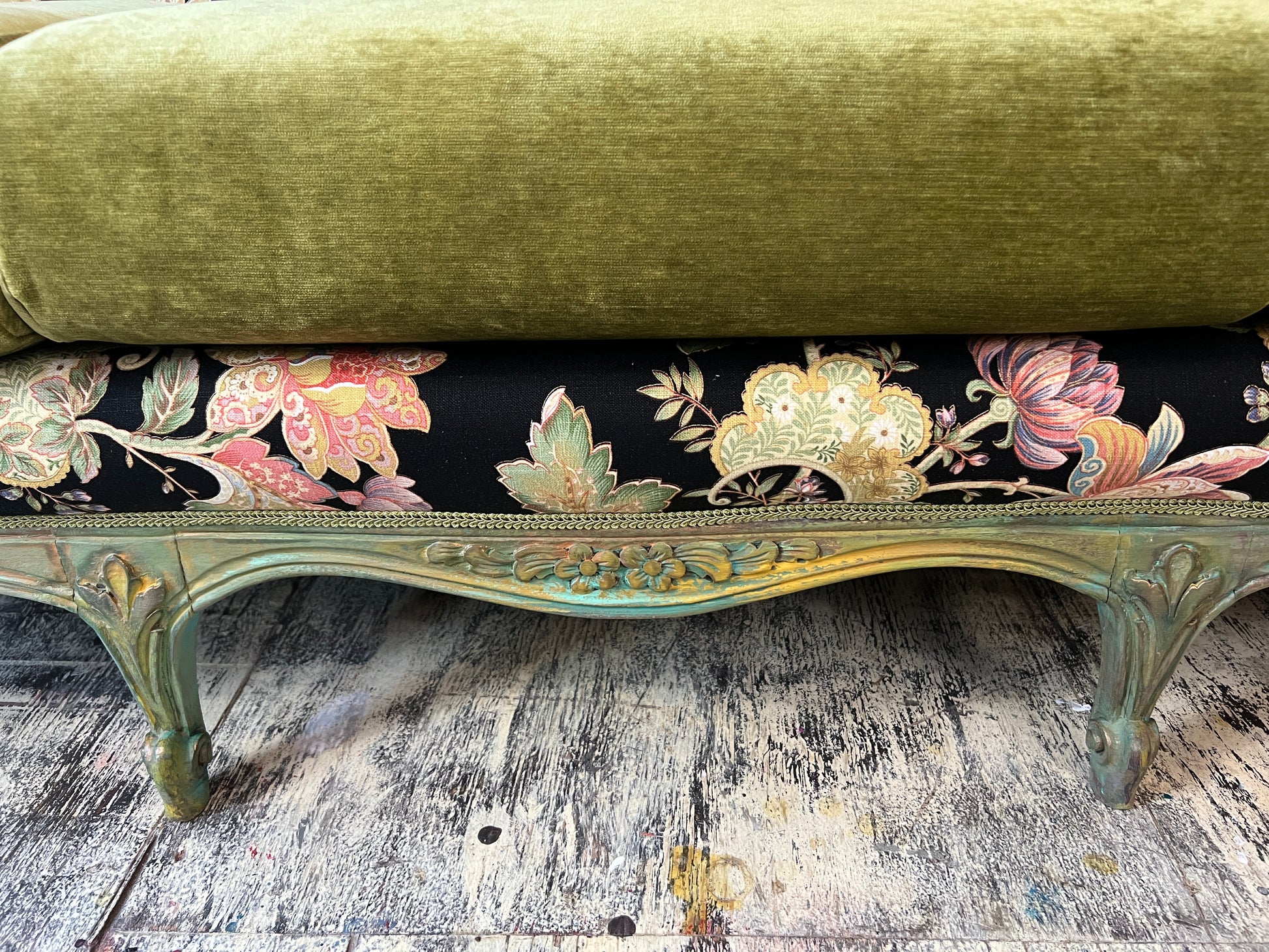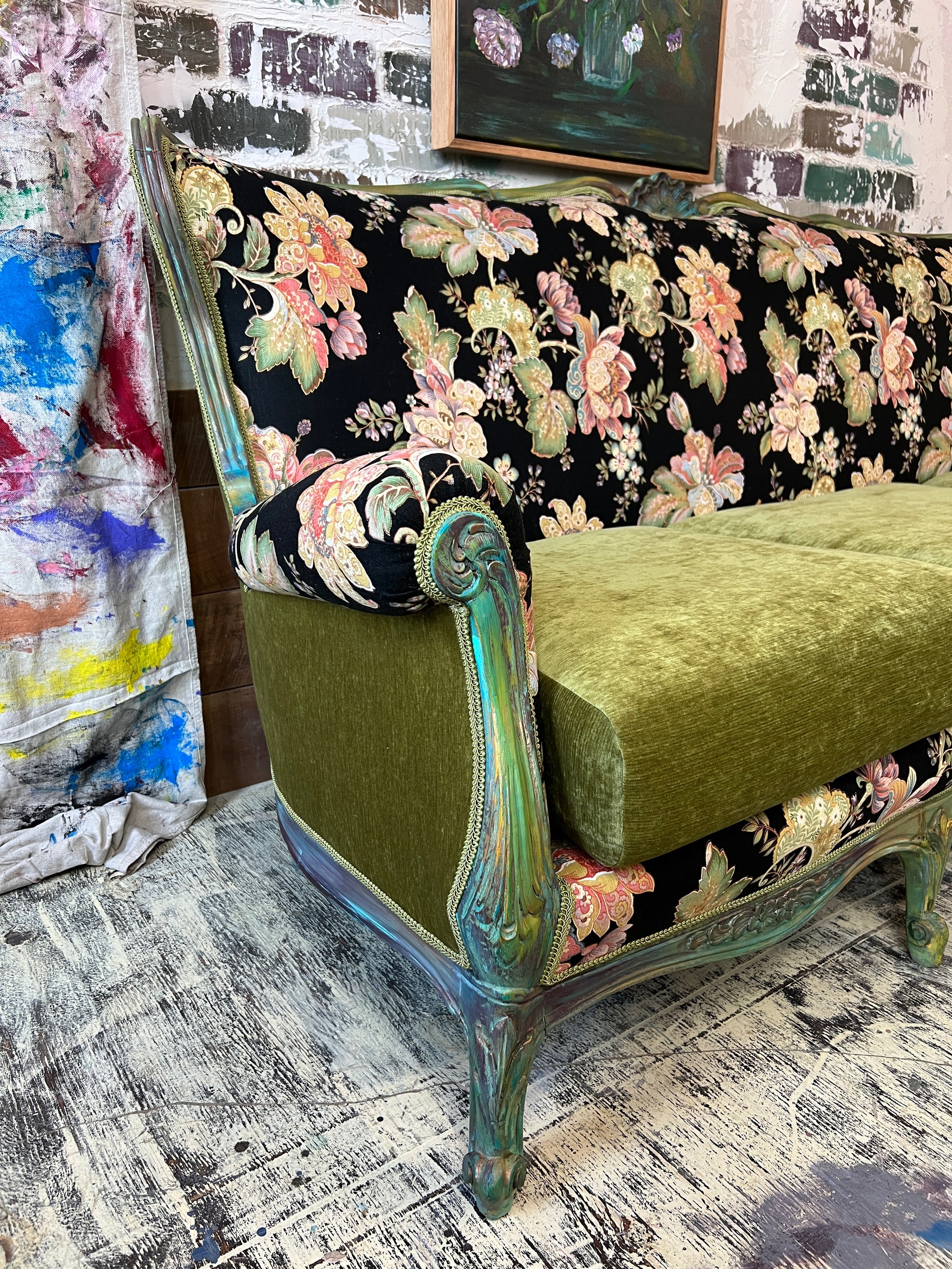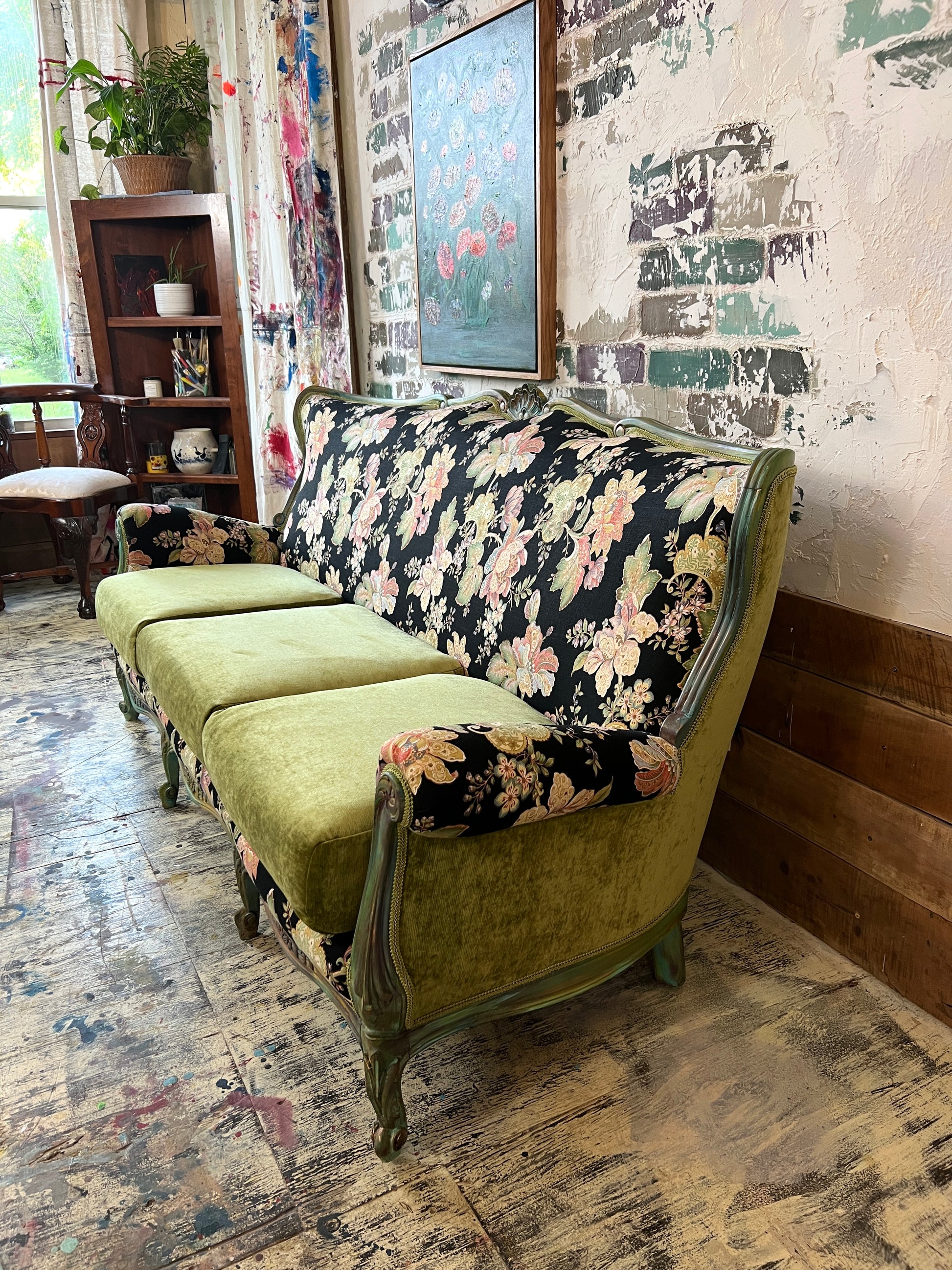Beautiful vintage sofa. This has been reupholstered with new foam and fabrics. Each detail has been enhanced with rich colors!