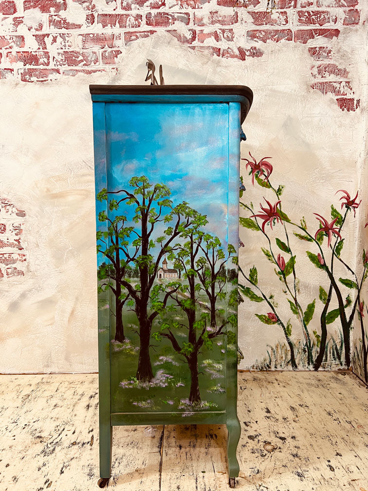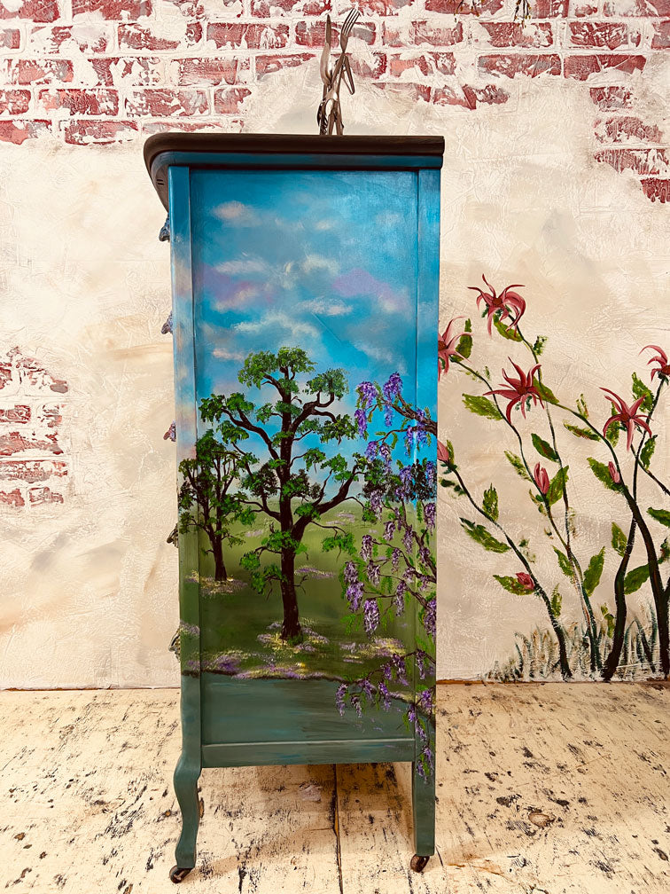This hand-painted vintage dresser has been reimagined as one-of-a-kind furniture art, blending coastal blue tones with soft floral undertones. Each brushstroke adds depth and texture, turning a solid vintage piece into original furniture artwork that feels like the last light of the day spilling into a quiet room.
