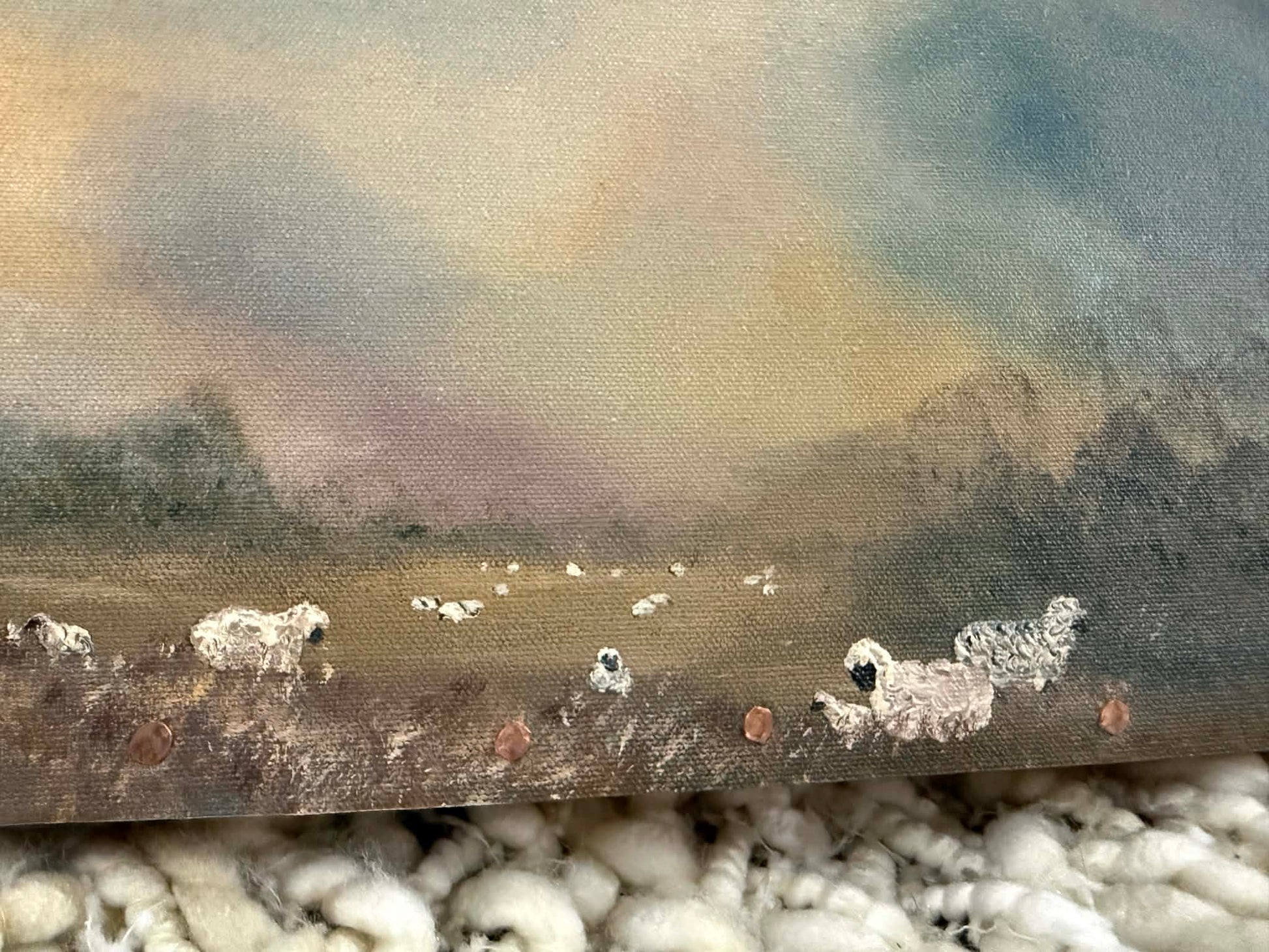 The Counting is an original landscape painting that reflects the quiet act of noticing ... of paying attention to what is present rather than what is missing. Small sheep rest in the field beneath a softened sky, reminding us that nothing here is overlooked, even in stillness.