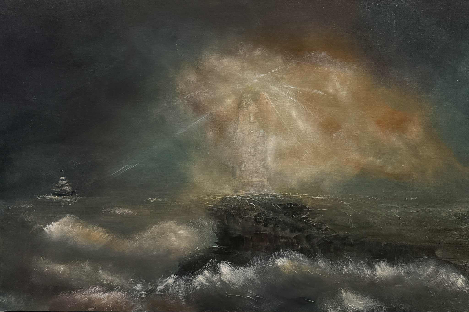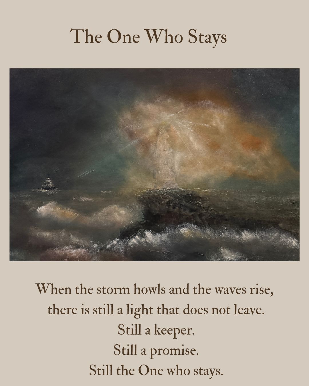 The One Who Stays is a painting born from the tension between chaos and calm, between feeling lost and being found. The lighthouse stands as a promise: that even when you can’t see your way home, there’s someone who never left His post. Someone who sees you. Guards you. Waits for you.