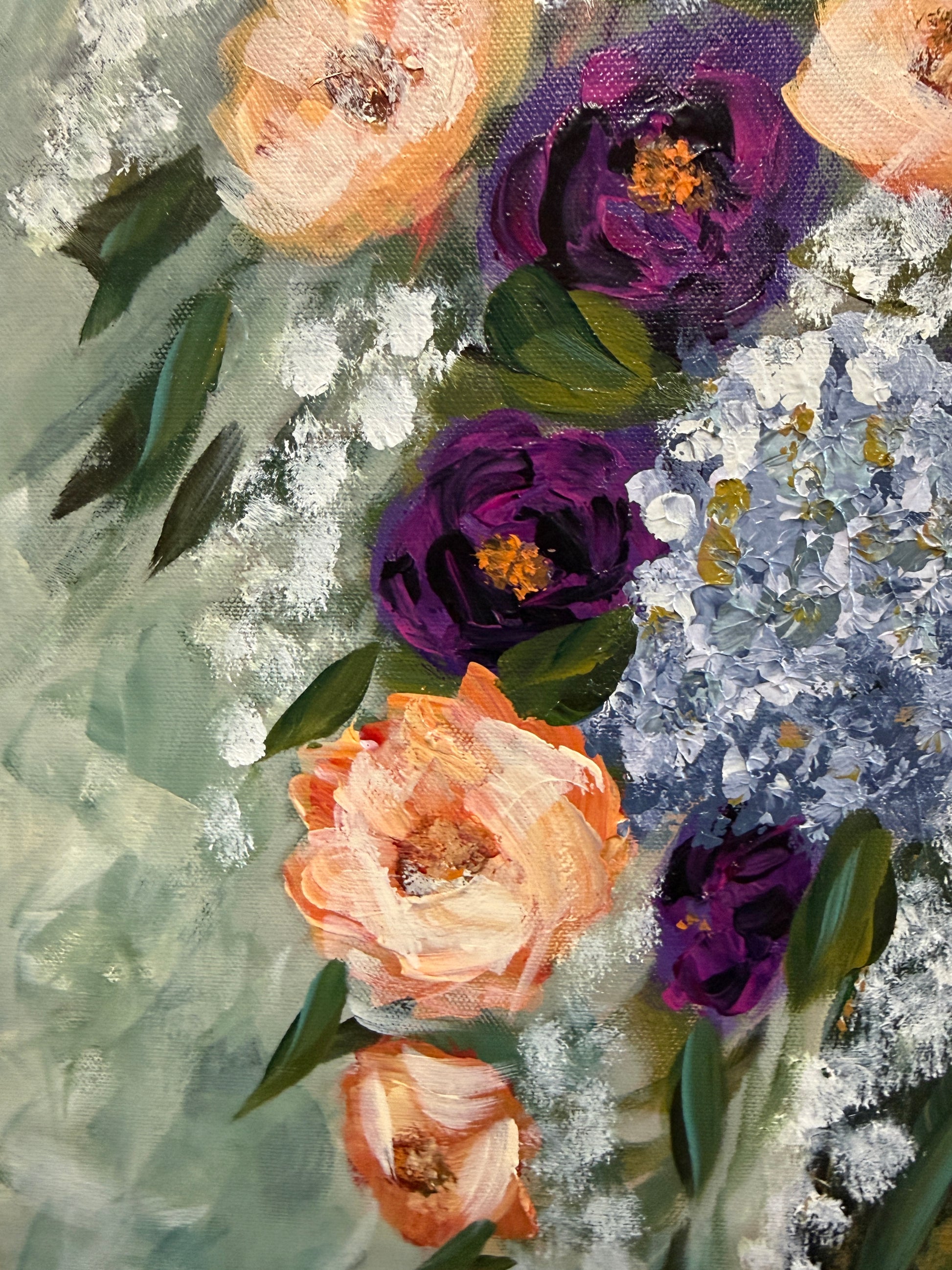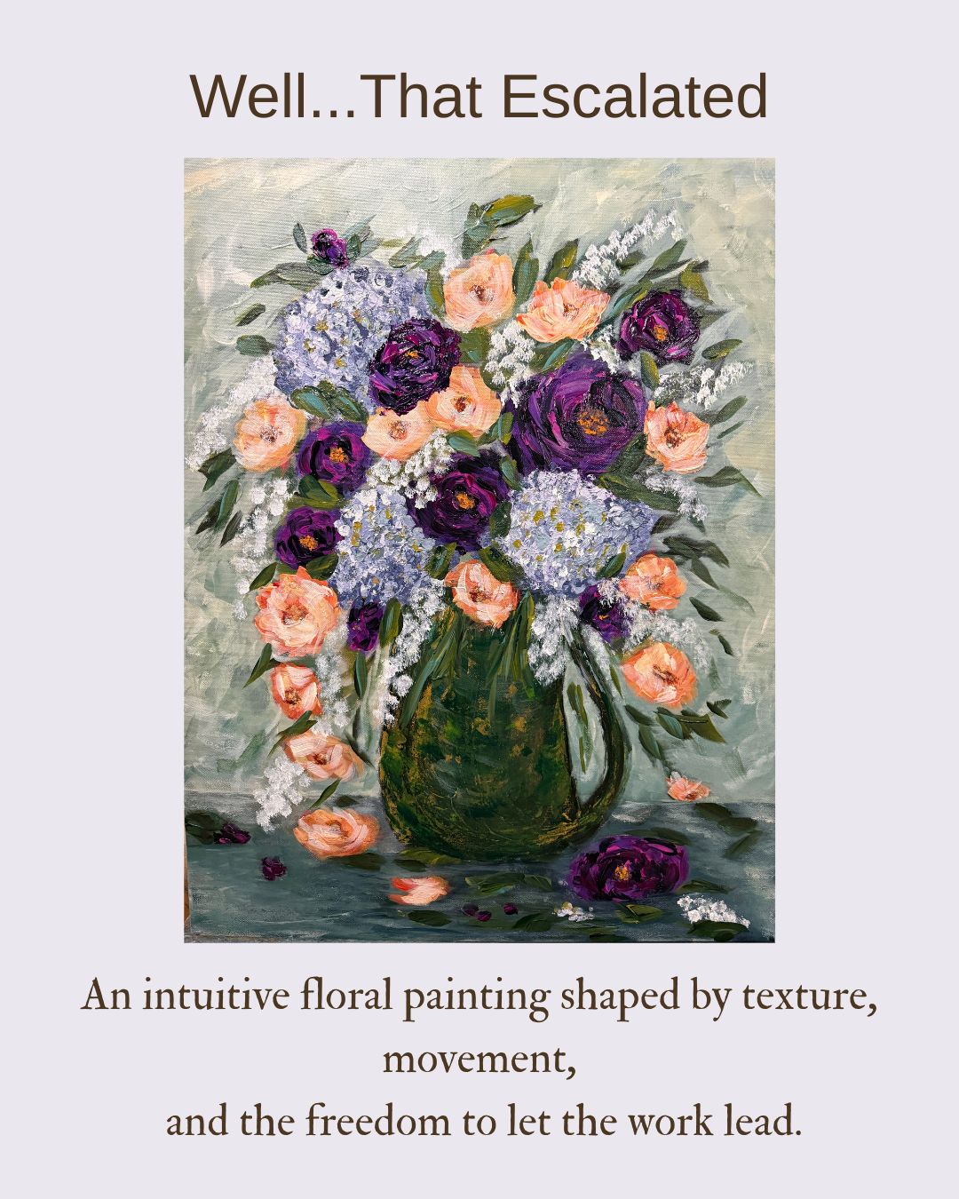 What started as a solution quickly became something more layered ...thick texture, intuitive color choices, and florals that refused to stay contained. The process unfolded naturally, without a plan, and the painting found its own presence along the way.