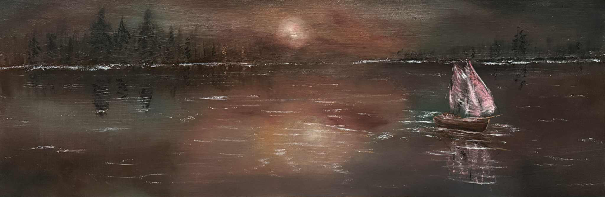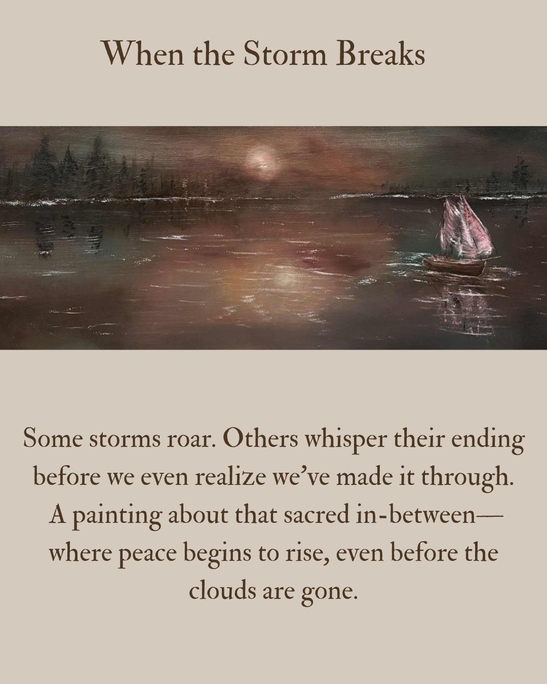When the Storm Breaks was painted in one of those sacred, in-between spaces—where the wind is still heavy in the air, but peace is beginning to rise. A sail catches the last glint of light. Water reflects the drama of the sky above, shifting from tension to stillness. And all around, the darkness doesn’t feel threatening—it feels like it’s finally giving way.